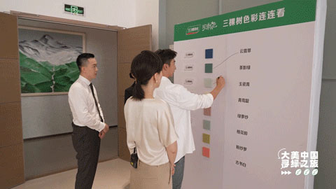 但想要成為一名合格的“粉刷匠”,需要經過多重考驗。三棵樹乳膠漆產品有多達1800種顏色,從選色到命名都融入了中國傳統色彩文化的深厚底蘊。在體驗“辨色”的過程中,武大靖最為傾心的“云霓翠”,也是三棵樹“國漆國色”主推色之一。