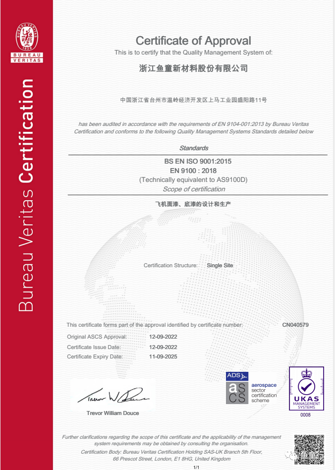 2022年9月,魚童取得了法國BV公司的AS 9100D航空航天裝備質量管理體系認證證書,標志著魚童正式進入航空涂料賽道并獲得了國際公司的認可。該標準是在ISO 9001質量體系要求基礎上開發的航空航天裝備質量管理標準,其評價內容多、章節細分標準高、實施過程嚴格、難度大;該體系認證得到了包括空客、波音、通用電氣等主要航空制造商的認可、支持與廣泛應用。