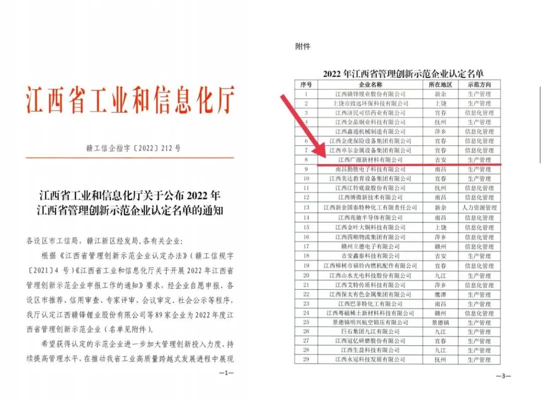 近日,江西省工業(yè)和信息化廳公布了“2022年江西省管理創(chuàng)新示范企業(yè)”認(rèn)定名單,廣源集團(tuán)旗下全資子公司江西廣源新材料有限公司憑借先進(jìn)的生產(chǎn)管理模式,榜上有名。