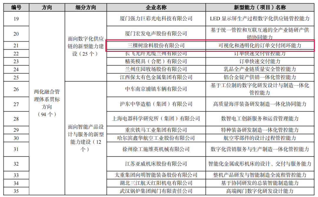 近日,國家工信部官網公示了“2022年新一代信息技術與制造業融合發展試點示范名單”,三棵樹涂料股份有限公司憑借數字化供應鏈的可視化和透明化的訂單交付閉環能力入選。