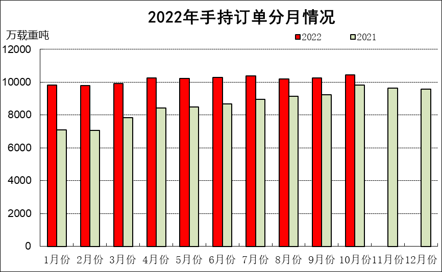 1~10月,全國造船完工3087萬載重噸,同比下降3.6%。承接新船訂單3740萬載重噸,同比下降39.2%。10月底,手持船舶訂單10444萬載重噸,同比增長6.5%。