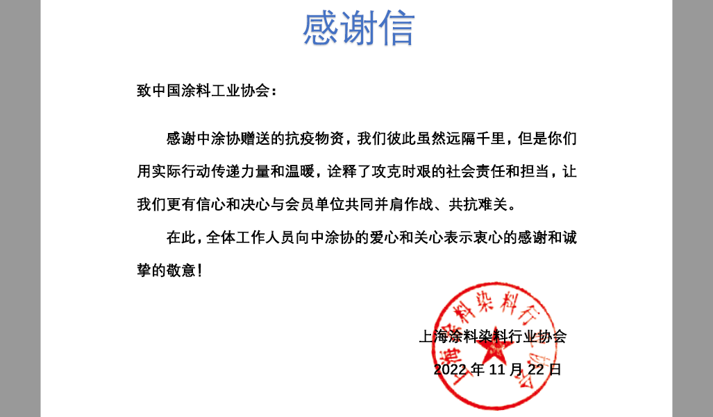 秉承“為企業(yè)發(fā)展服務(wù),為行業(yè)振興服務(wù)”的宗旨、竭誠為會員單位服務(wù)的理念,中國涂料工業(yè)協(xié)會時刻關(guān)注、關(guān)心涂料行業(yè)的一舉一動,面對本次洶涌而來的疫情,協(xié)會以實際行動助力防控,發(fā)揮社會團體的使命擔(dān)當(dāng),展現(xiàn)作為涂料人“攜手同行、風(fēng)雨同舟”的大愛精神,為堅守在抗疫一線的涂料人送去關(guān)愛和溫暖,為他們繼續(xù)堅守崗位、逆行而上注入了溫暖、堅定的力量。相信在大家的共同努力下,一定能夠凝聚起眾志成城、全力以赴、共克時艱的強大力量,打贏本次疫情防控阻擊戰(zhàn)。