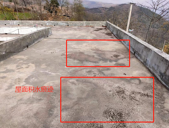 在考察的過程中,韓工發現小學是老舊屋面,大面積分布著龜裂紋,同時存在較大裂縫,漏水較為嚴重。整個屋面無找坡層,平整度較差,低洼處存在嚴重的積水現象,且落口管口全部被雜物堵死。