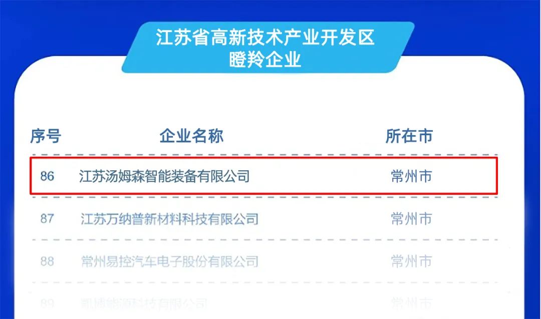 江蘇省高新技術(shù)產(chǎn)業(yè)開發(fā)區(qū)瞪羚企業(yè):江蘇湯姆森智能裝備有限公司