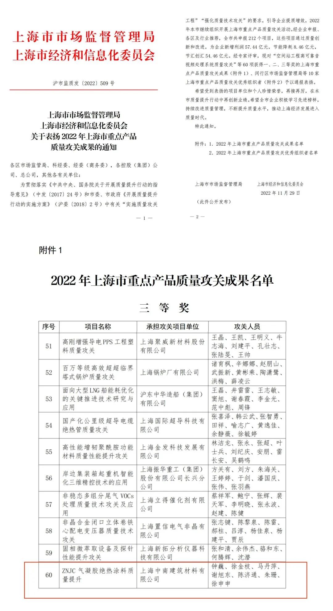經(jīng)企業(yè)申報(bào)、各區(qū)及行業(yè)推薦,全市共申報(bào)212個(gè)項(xiàng)目,這些項(xiàng)目通過(guò)質(zhì)量創(chuàng)新和改進(jìn),為企業(yè)新增利潤(rùn)57.44億元,節(jié)能降耗8.46億元,節(jié)匯創(chuàng)匯54.46億元。經(jīng)專(zhuān)家評(píng)審,共計(jì)評(píng)選出60項(xiàng)上海市重點(diǎn)產(chǎn)品質(zhì)量攻關(guān)成果獎(jiǎng)。其中,中南建材“ZNJC氣凝膠絕熱涂料質(zhì)量提升”項(xiàng)目榮獲2022年上海市重點(diǎn)產(chǎn)品質(zhì)量攻關(guān)成果三等獎(jiǎng)。