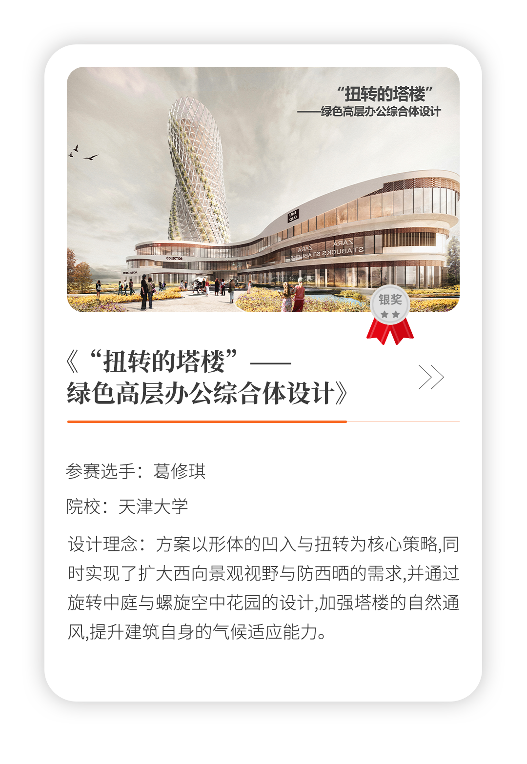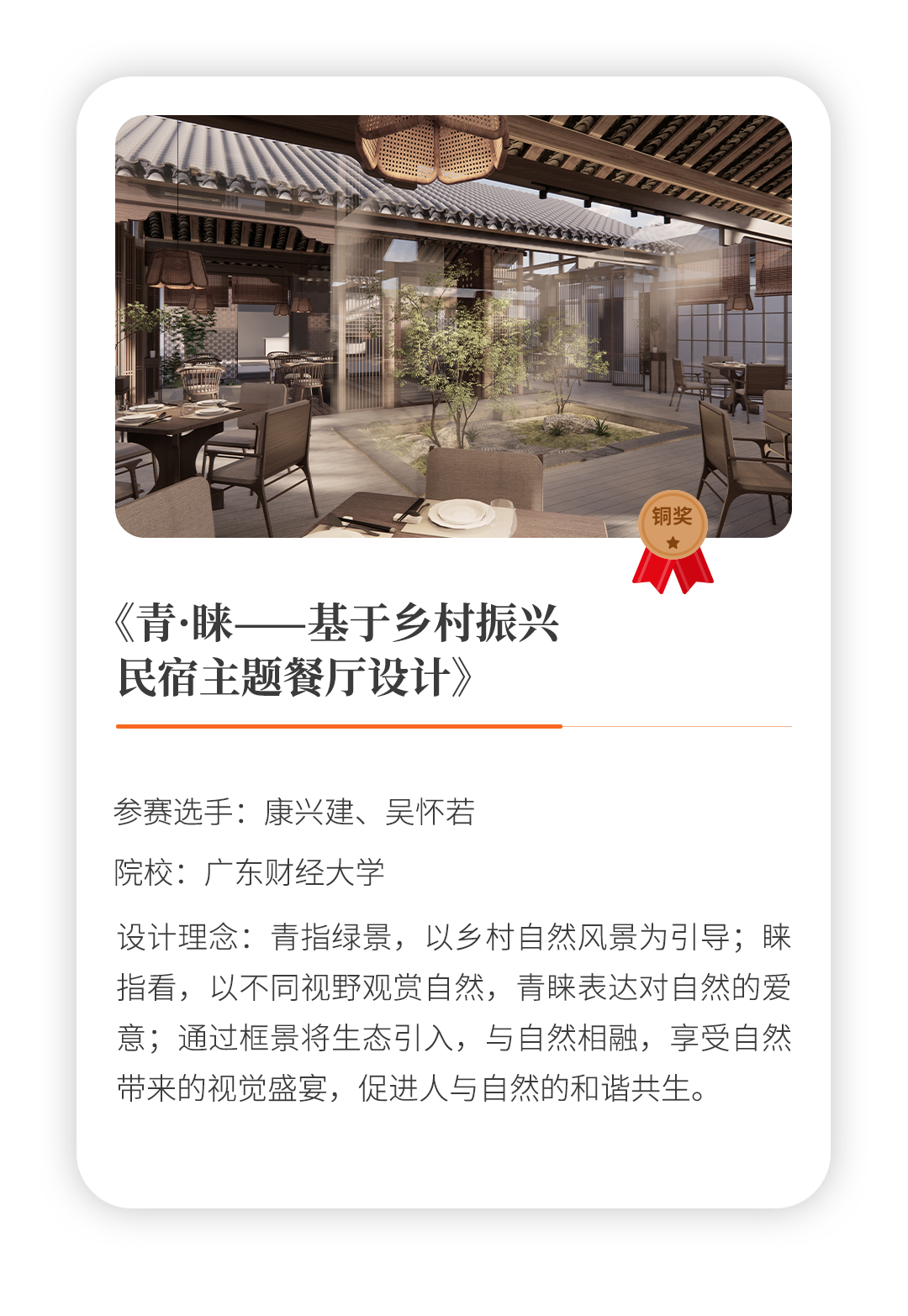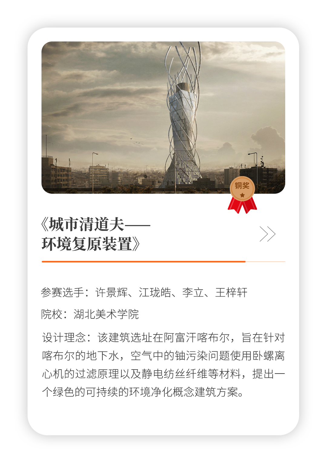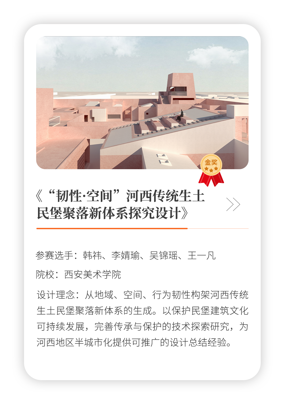 賽事設(shè)置建筑設(shè)計和室內(nèi)設(shè)計兩條賽道,圍繞“生態(tài)人居,永續(xù)精‘彩’”這一主題對作品提出了不同的要求。在八位專業(yè)評委與聯(lián)合主辦方評審團的見證下,來自西安美術(shù)學(xué)院的韓祎、李婧瑜、吳錦瑤、王一凡創(chuàng)作的《“韌性·空間”河西傳統(tǒng)生土民堡聚落新體系探究設(shè)計》和來自清華大學(xué)美術(shù)學(xué)院的姚金昊、李禹霏創(chuàng)作的《夢境邊緣—酒吧設(shè)計》脫穎而出,分別摘得建筑組和室內(nèi)組金獎。