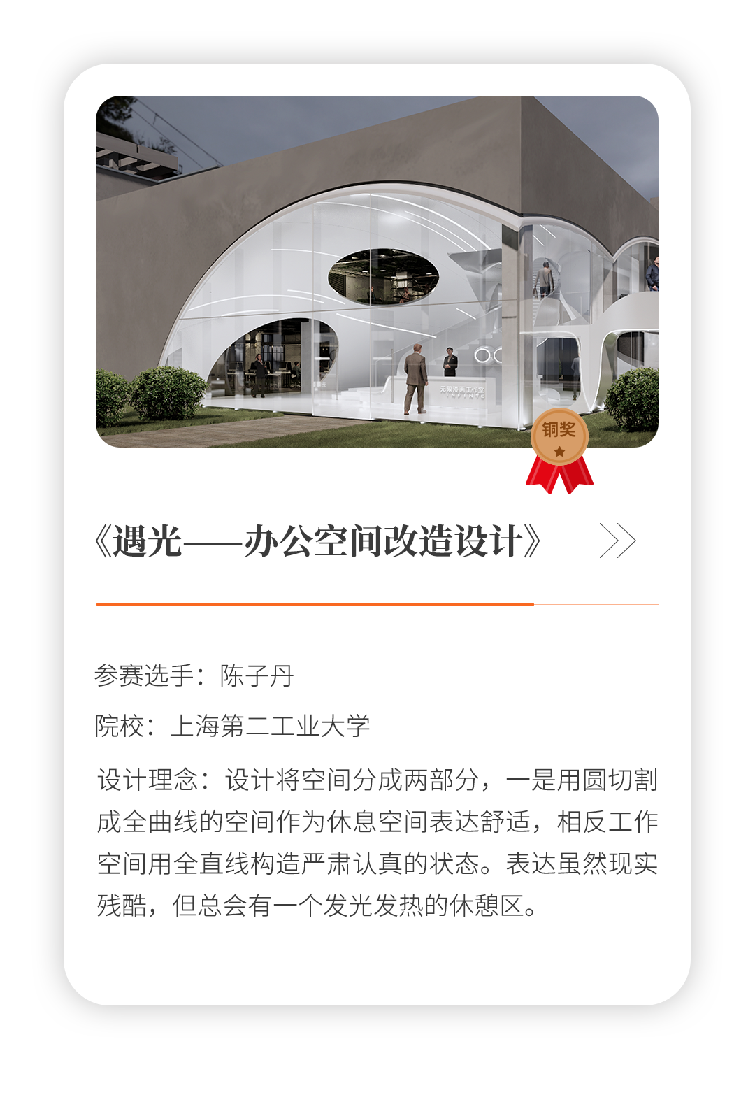 該作品提取《盜夢空間》中經(jīng)典的夢境的世界觀,以層層嵌套的夢境為深入線索,運用具象與抽象相結(jié)合、空間內(nèi)部與空間邊界虛實變化等方式,塑造出一個遠離真實世界的第三世界——沉浸式酒吧。作品通過獨特的空間結(jié)構(gòu)、色彩與材質(zhì)的創(chuàng)意性突破,營造出了一個有利于身心放松的室內(nèi)空間環(huán)境,希望客人們在一天的繁忙勞碌之后走進酒吧,能夠像進入夢鄉(xiāng)沉浸于夢中那般的愉悅,與空間進行更深層次的交互,充分展示了出未來理想人居空間的藍圖。