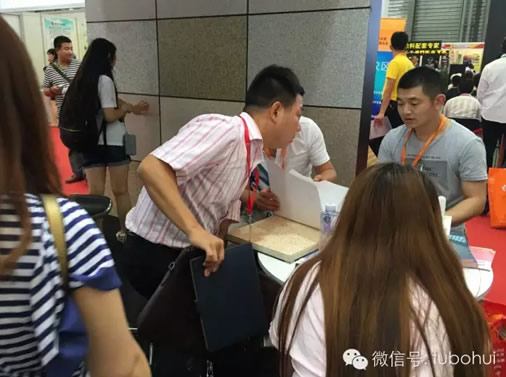 展會的另一大亮點:鼎彩漆。此次鼎彩漆展示采用真的石頭和鼎彩漆涂料樣板對比的形式,鱷魚鼎彩漆樣板與石材幾乎亂真的表面紋理效果,充分體現出石材的厚重感的同時由于其涂層薄,自重輕,不影響建筑物的承重,深受甲方歡迎。在所有參觀者中有一位來自尼泊爾的買家給我們留下了深刻的印象,由于語言的限制,深諳英語口語的工程師王律擔任了接待這位客戶的重擔,相信王工流利的口語、專業的產品知識解答也同樣給尼泊爾買家一個的印象。